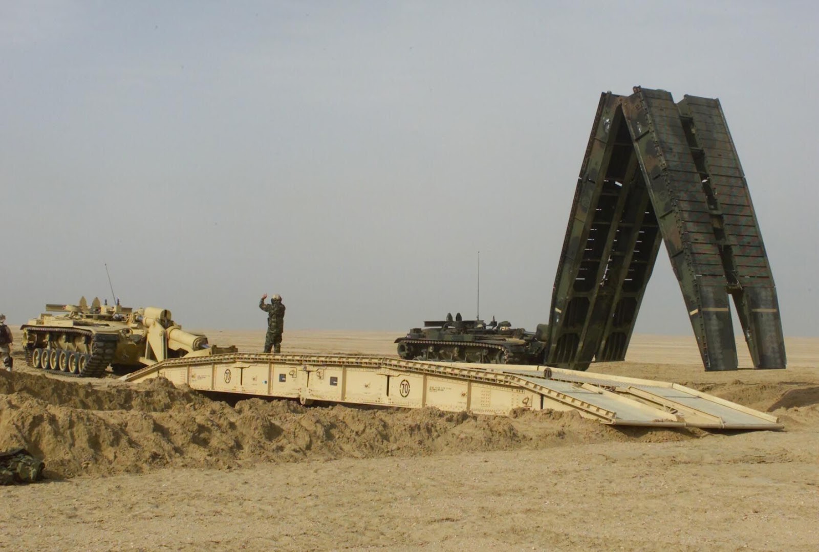 Armoured Vehicle Launched Bridge (AVLB)The bridge layer unfolds and launches its cargo, providing a ready-made bridge across the obstacle in only minutes. Once the span has been put in place, the AVLB vehicle detaches from the bridge, and moves aside to allow traffic to pass. Once all of the vehicles have crossed, it crosses the bridge itself and reattaches to the bridge on the other side. It then retracts the span ready to move off again. A similar procedure can be employed to allow crossings of small chasms or similar obstructions. AVLBs can carry bridges of 60 feet (19 metres) or greater in length. By using a tank chassis, the bridge layer is able to cover the same terrain as main battle tanks, and the provision of armour allows them to operate even in the face of enemy fire. However, this is not a universal attribute: some exceptionally sturdy 6x6 or 8x8 truck chassis have lent themselves to bridge-layer applications.