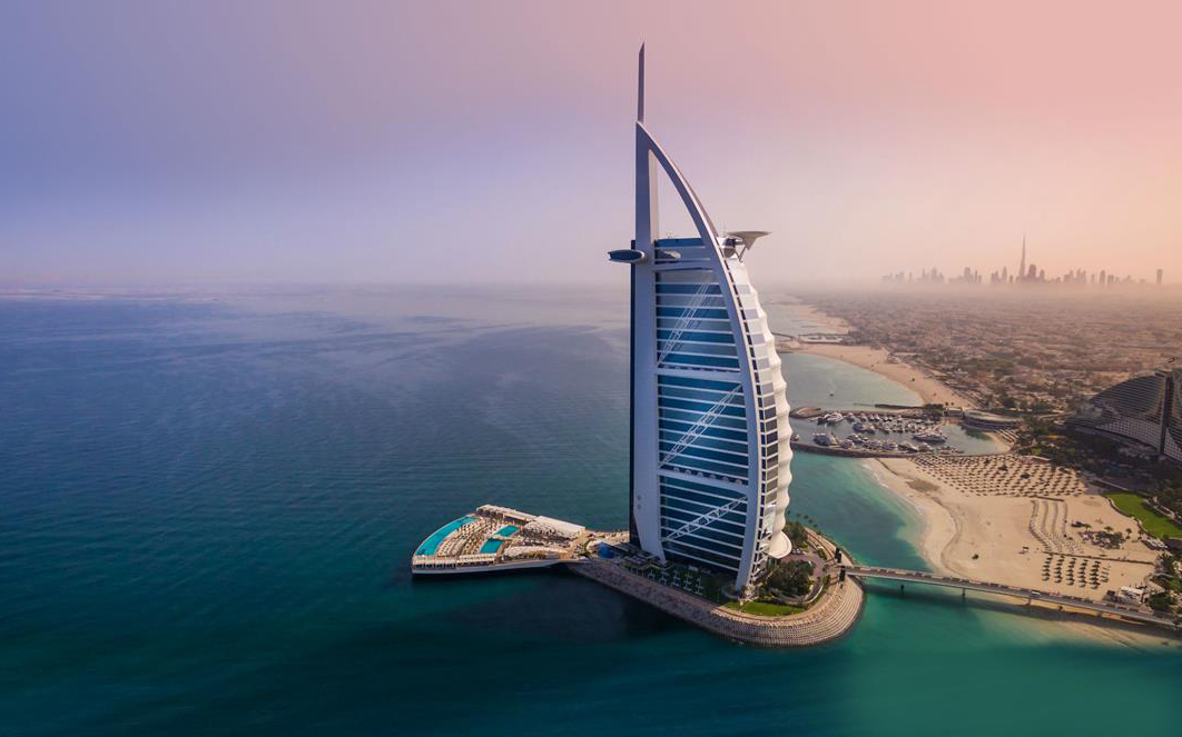 The Burj Al Arab is a luxury hotel located in Dubai, United Arab Emirates. Of the tallest hotels in the world, it is the fifth tallest, although 39% of its total height is made up of non-occupiable space. Burj Al Arab stands on an artificial island 280 m (920 ft) from Jumeirah Beach and is connected to the mainland by a private curving bridge. The shape of the structure is designed to resemble the sail of a ship. It has a helipad near the roof at a height of 210 m (689 ft) above ground.