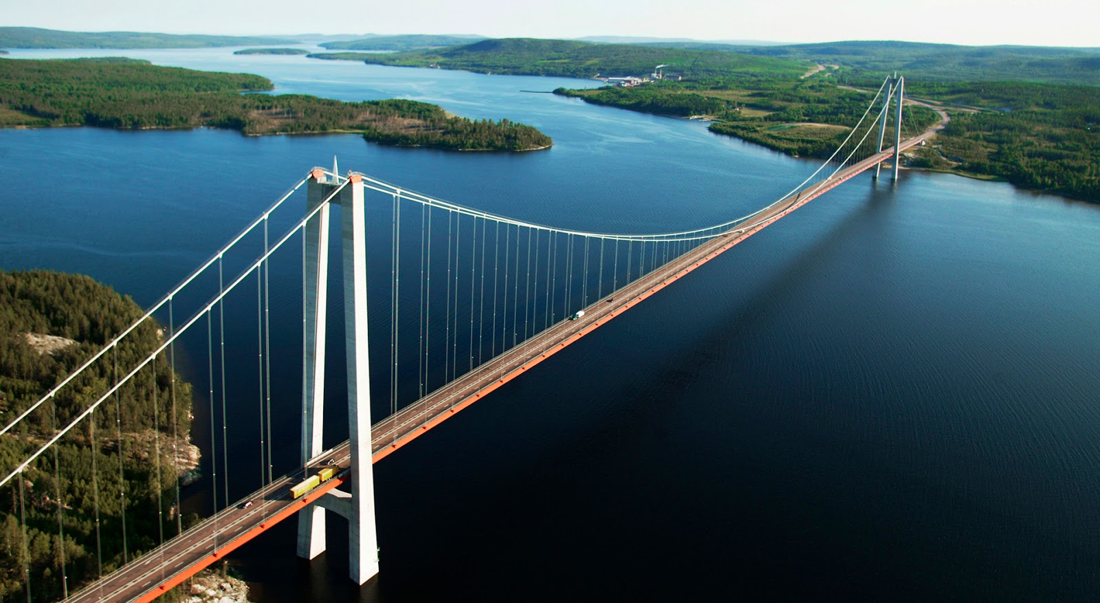 The High Coast Bridge (Högakustenbron or Vedabron) is a suspension bridge crossing the mouth of the river Ångermanälven near Veda, on the border between the Härnösand and Kramfors municipalities in the province of Ångermanland in northern Sweden. The area is often referred to as The High Coast, hence its name. The bridge replaces Sandöbron, the old bridge across the river, in a new extension of the European route E4. It is (as of 2016) the third longest suspension bridge in Scandinavia (after the Great Belt Fixed Link in Denmark and Hardanger Bridge in Norway), the fourth longest in Europe, and the 16th longest of the world.